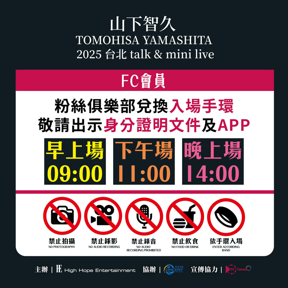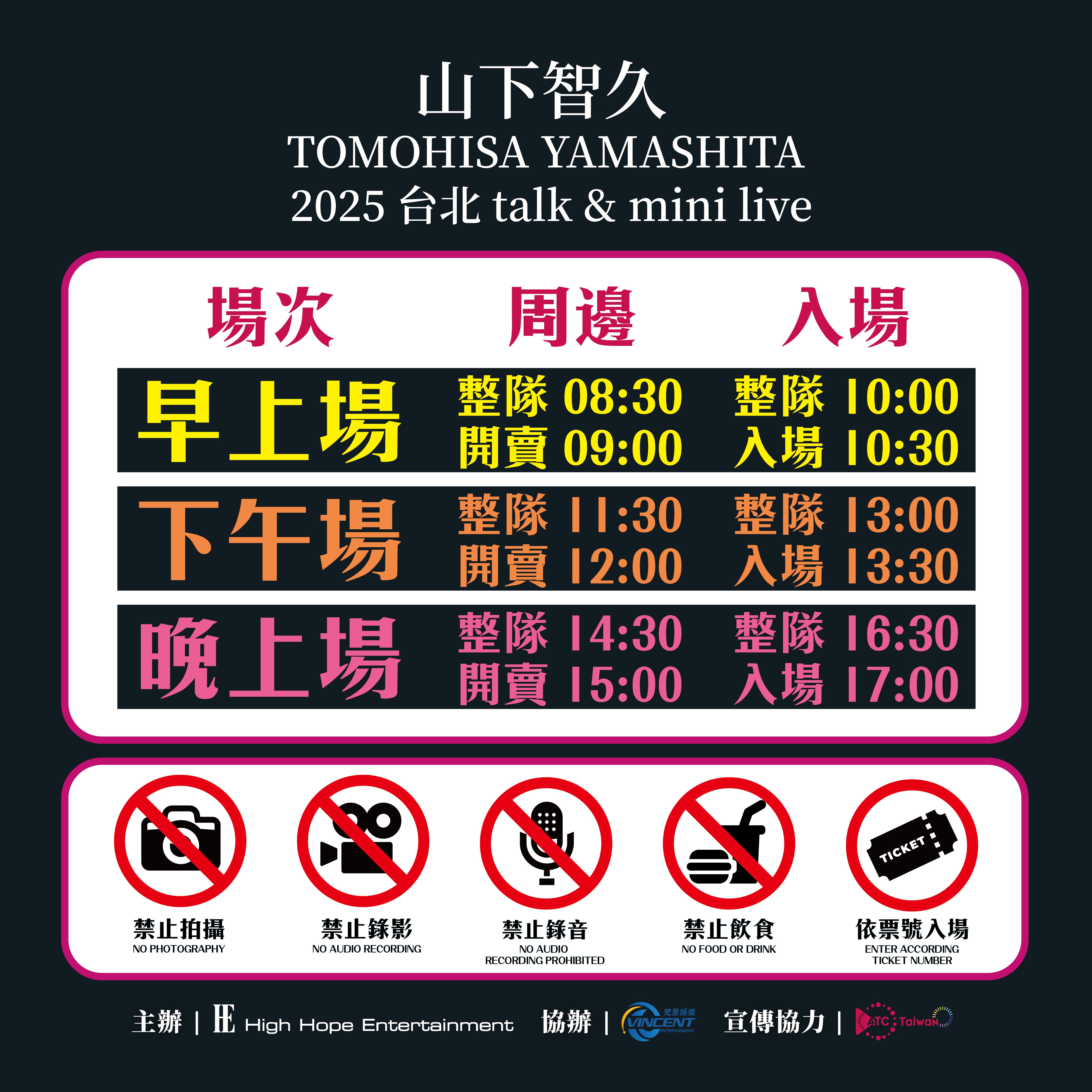以下是关于『山下智久2025 台北 talk&mini live』公演当天入场须知,来场前敬请阅读以下需知,以免权益受损。