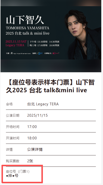 在本网站购买『山下智久2025 台北 talk&mini live』公演门票的观众,以下是关于您门票座位的通知